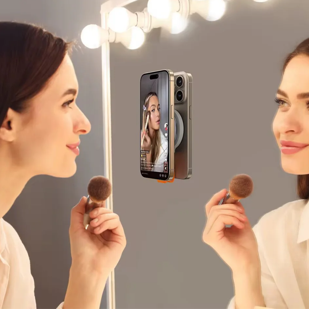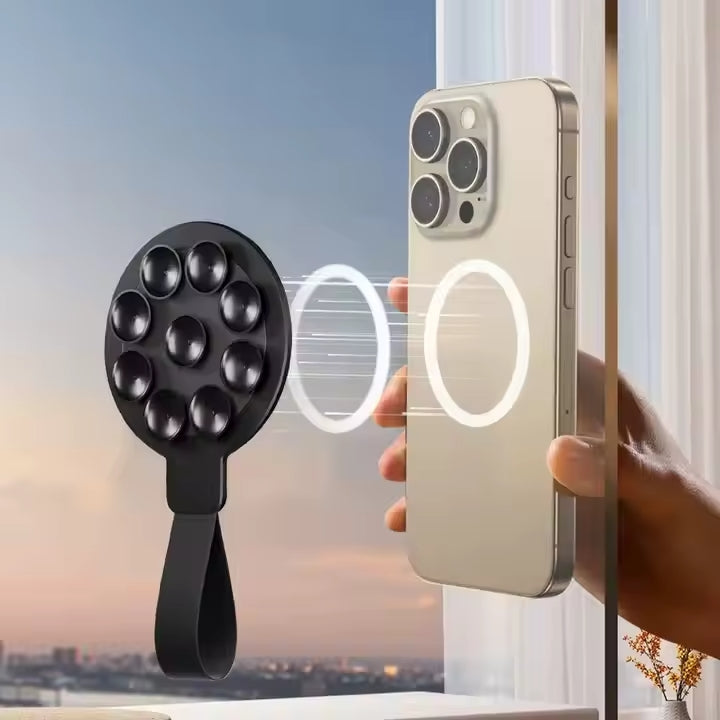 Its magnetic base clicks effortlessly onto your phone (or any MagSafe-compatible case), while the mini suction cups attach to virtually any smooth surface—walls, mirrors, windows, desks, and more.